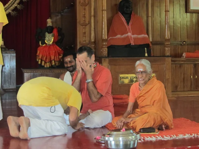 One of the students showing their respect for a Swami and Shambu (he was even more humble than when he was teaching his class).